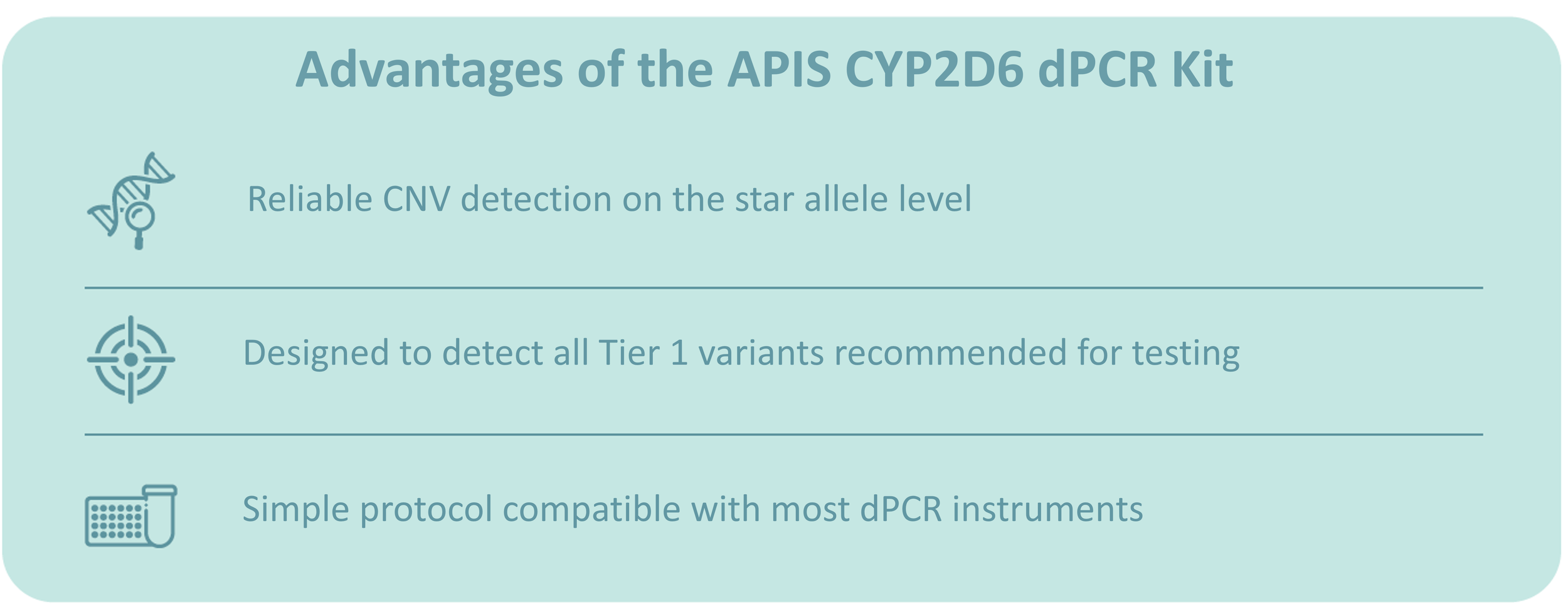 The APIS CYP2D6 dPCR Kit is a robust digital PCR (dPCR) workflow designed to detect all Tier 1 AMP¹ alleles, providing reliable copy number variation (CNV)